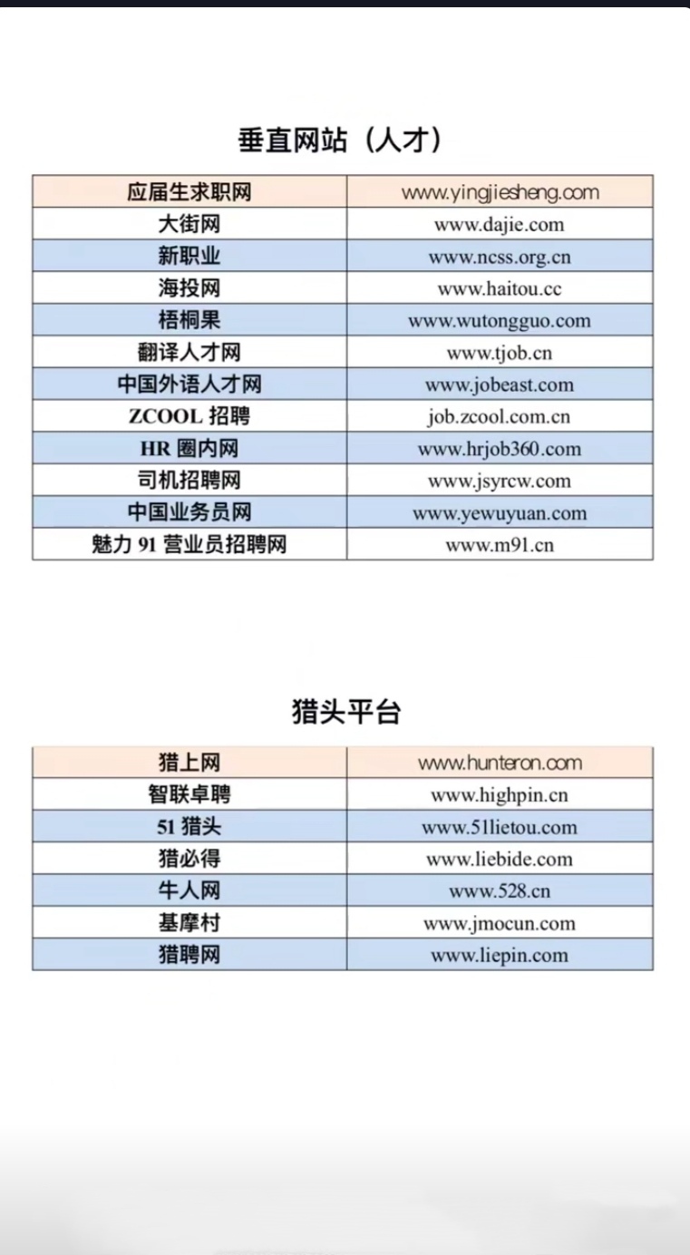 为了方便可大家可以尽快的找到适合自己的招聘网站,我把全部常见网站的名称和网址进行了汇总,希望可以对你们有所帮助。如图所示:
