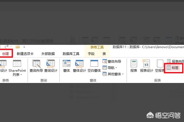 2、点击选择上面的【创建】,再选择报表选项组里面的【标签】。