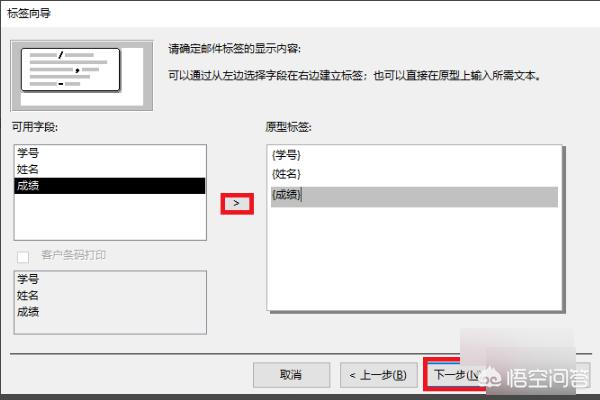 5、点击【>】将字段加入到右边的方框里面,点击【下一步】。