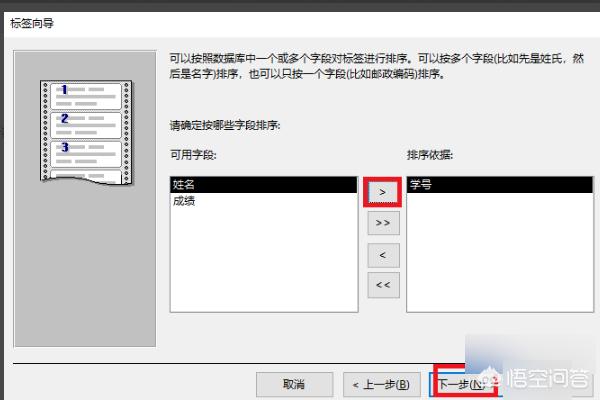 6、选择一个字段作为排序的依据,例如【学号】。点击【下一步】。