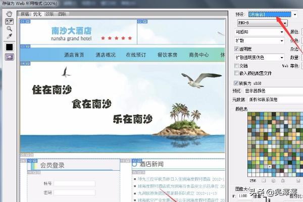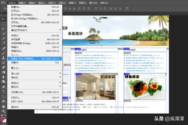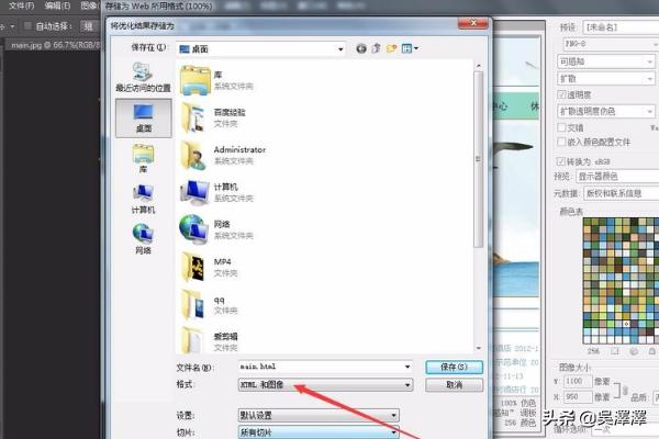 4. 导出网页,选择“存储为Web所用格式”,设置导出选项,包括文件格式图片质量压缩等。