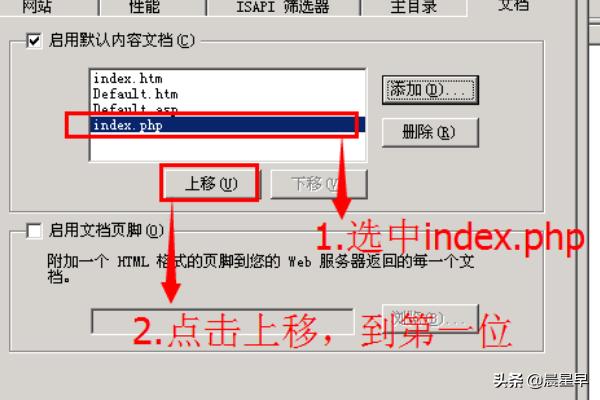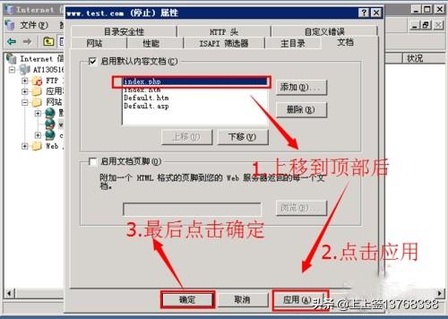 12、选中添加好的内容页(index.php或者index.html,index.asp,index.htm),点击上移到第一位;如下图所示: