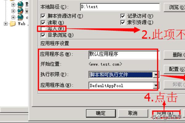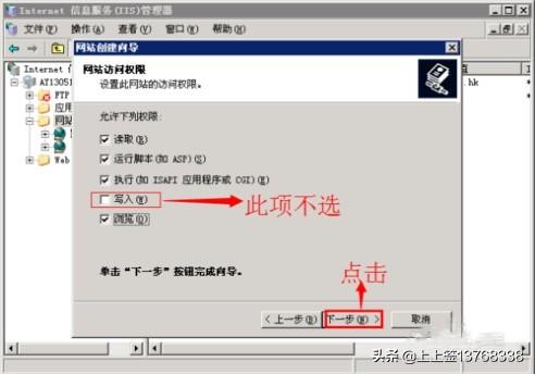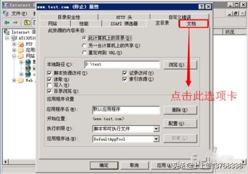 8、选中刚才新建的网站,并右键,选择属性选项;然后再弹出的选项卡里点击:主目录,然后再主目录下的内容里,不选中写入项,然后点击应用;如下图所示: