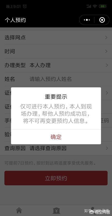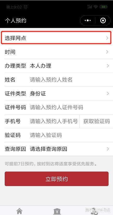 5、选择办理的网点,一般是选择你本人最方便的网点,再完整如实填入其它相关信息,点击“立即预约”就可以啦!