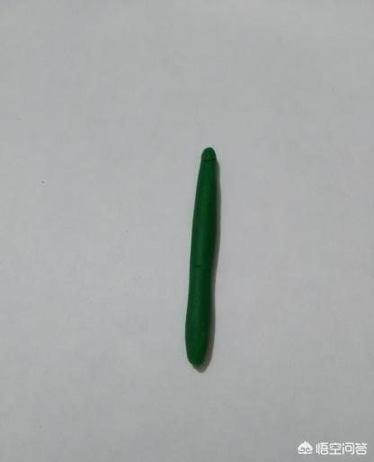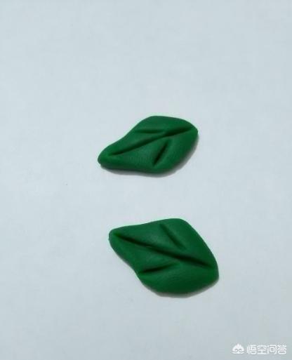 7、用深绿色捏两个菱形,当作叶子,用小刀在叶子上面分别刻三条线,当作叶脉。