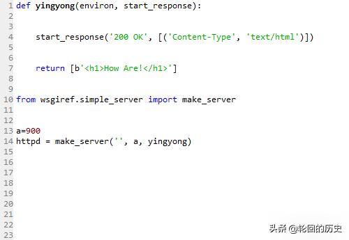 3创建服务器,IP为空,端口号为900。a=900httpd = make_server('', a, yingyong)这个服务器将调用前面的函数 yingyong。