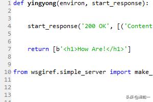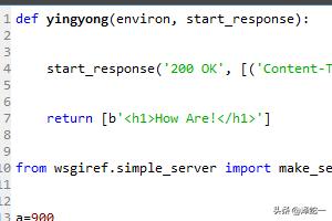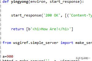 6关闭python编译器,服务器也就关闭了,这个网页会立刻崩溃。再打开python并运行这段代码,这个网页又会立刻恢复。完整代码如下:def yingyong(environ, start_response): start_response('200 OK', [('Content-Type', 'text/html')]) return [b'<h1>How Are!</h1>']from wsgiref.simple_server import make_servera=900httpd = make_server('', a, yingyong)httpd.serve_forever()。