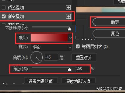 3、在渐变叠加的图层样式里,设置【径向】渐变的样式,缩放到150%,点击【确定】。